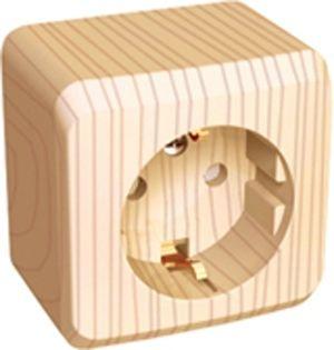 Розетка Systeme Electric (ранее Schneider Electric) ЭТЮД (сосна, открытой установки) одноместная, с заземлением и шторками предназначена для применения в сетях до 250В, на ток до 16А. Шторки открываются при одновременном давлении в оба отверстия и препятствуют проникновению посторонних предметов. Они обеспечивают дополнительную безопасность в доме, где находятся дети. Изделия цвета Сосна обладают уникальным рисунком, напоминающим древесный сруб. Сделано в России.