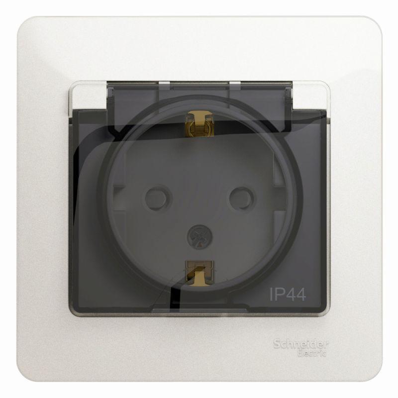 Розетка Systeme Electric (ранее Schneider Electric) серии Glossa (в сборе, цвет перламутр) одинарная с заземлением, шторками и крышкой подходит для сетей 250 В, на ток 16 А. - Изделие со степенью защиты IP44 обеспечит безопасность использования в ванной и на кухне. - Заземляющий контакт обеспечивает дополнительную защиту от удара электрическим током. При наличии заземления электрический потенциал уходит в землю, защищая человека. - Выполнен из материала PС+ASA, стойкого к УФ-излучению и появлению царапин.