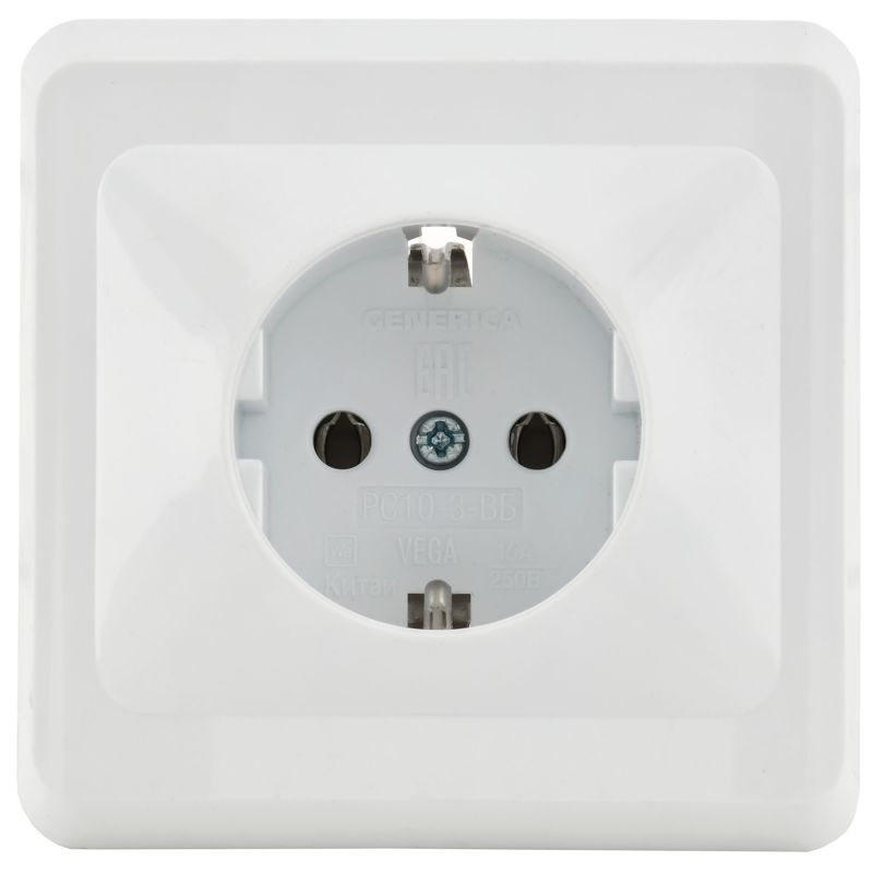 Розетка 1-м СП Вега РС10-3-ВБ с заземл. контактом без защ. штор 16А бел. GENERICA ERV11-K01-16-DM
