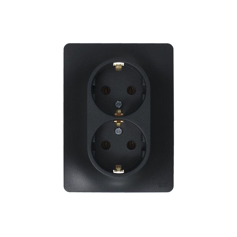 Розетка двойная Systeme Electric (ранее Schneider Electric) серии Glossa (в сборе, цвет антрацит) с заземлением, без шторок подходит для сетей 250 В, на ток 16 А. - Заземляющий контакт обеспечивает дополнительную защиту от удара электрическим током. При наличии заземления электрический потенциал уходит в землю, защищая человека. - Выполнен из материала PС+ASA, стойкого к УФ-излучению и появлению царапин. - Двойная розетка позволяет подключить два устройства в одном месте.