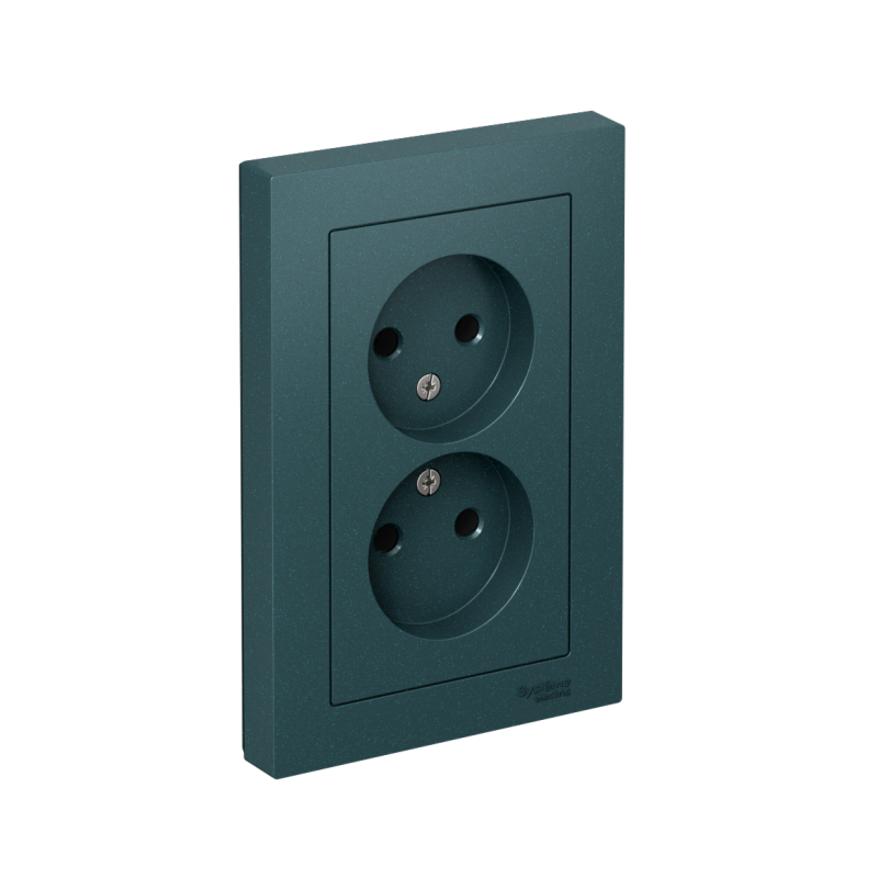 Розетка двойная Systeme Electric (ранее Schneider Electric) серии AtlasDesign (в сборе, цвет изумруд) без заземления и без шторок подходит для сетей 250 В, на ток 16 А. - Лицевые детали из качественного ABS-пластика, устойчивого к царапинам и УФ-излучению. - Двойная розетка позволяет подключить два устройства в одном месте. - Изделие поставляется в комплекте с рамкой того же цвета. - Усиленные прямые монтажные лапки для лучшей фиксации механизма в монтажной коробке.