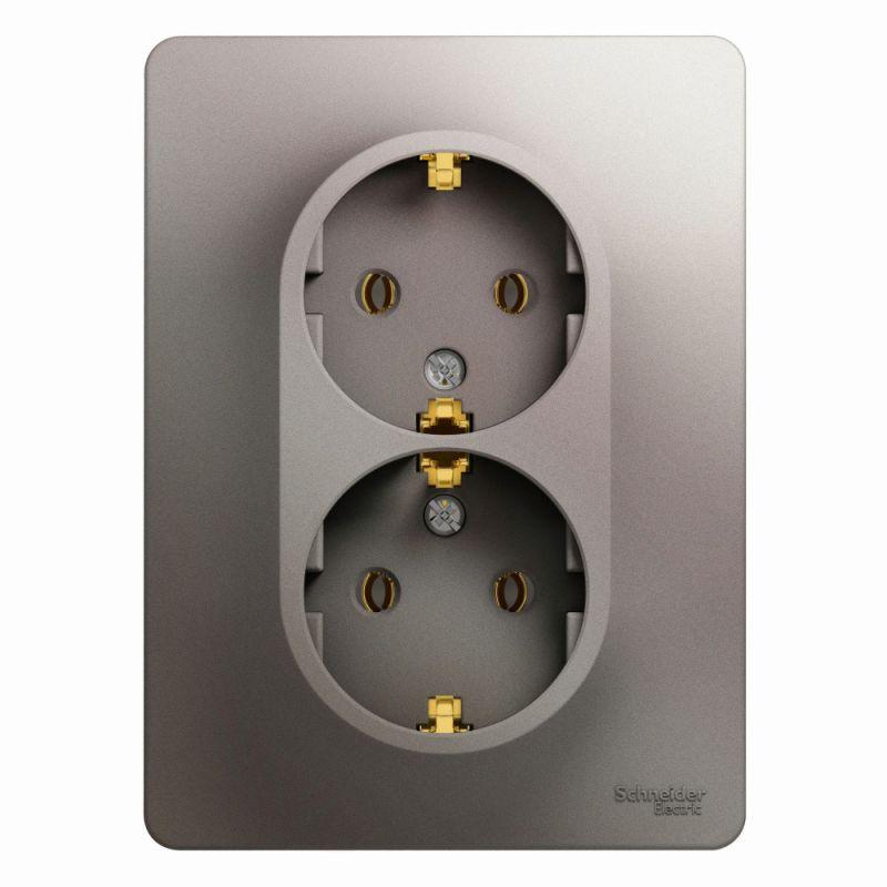 Розетка двойная Systeme Electric (ранее Schneider Electric) серии Glossa (в сборе, цвет платина) с заземлением, без шторок подходит для сетей 250 В, на ток 16 А. - Заземляющий контакт обеспечивает дополнительную защиту от удара электрическим током. При наличии заземления электрический потенциал уходит в землю, защищая человека. - Выполнен из материала PС+ASA, стойкого к УФ-излучению и появлению царапин. - Двойная розетка позволяет подключить два устройства в одном месте.
