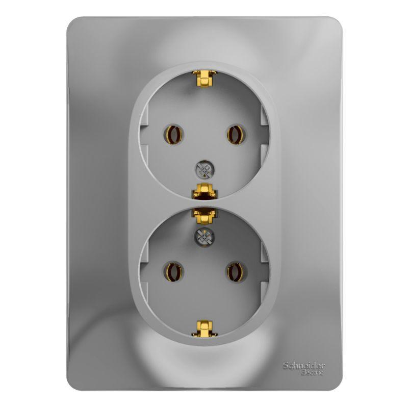 Розетка двойная Systeme Electric (ранее Schneider Electric) серии Glossa (в сборе, цвет алюминий) с заземлением, без шторок подходит для сетей 250 В, на ток 16 А. - Заземляющий контакт обеспечивает дополнительную защиту от удара электрическим током. При наличии заземления электрический потенциал уходит в землю, защищая человека. - Выполнен из материала PС+ASA, стойкого к УФ-излучению и появлению царапин. - Двойная розетка позволяет подключить два устройства в одном месте.
