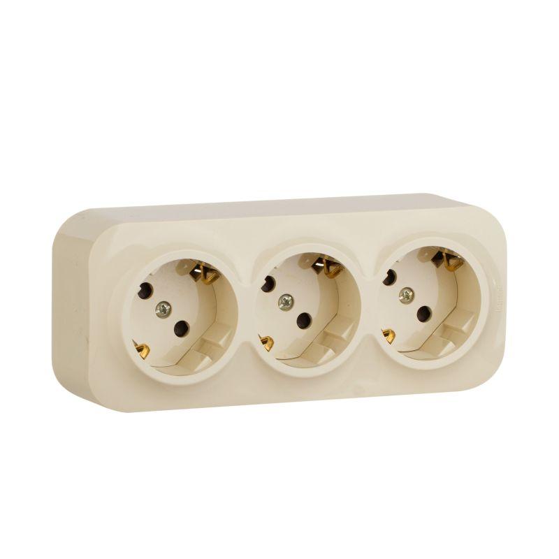 Тройная розетка с заземлением, со шторками Legrand Quteo, цвет слоновая кость, для открытого монтажа. Максимальный ток 16 А, максимальная мощность 3680 Вт. Применяется в зданиях, оборудованных для повышения безопасности проводкой с заземлением (с защитным проводником). Рекомендуются к применению в помещениях в которых могут быть дети. Шторки осуществляют защитную функцию путём ограничения доступа к токоведущим контактам. Доступ открывается только при подключении вилки. Особенности - Все токоведущие части имеют защиту от случайного прикосновения. - Простота подключения. Что бы подключить весь блок, достаточно подвести питание к одной розетке, следуя схеме на упаковке. - Контактная группа изготовлена из латуни CuZn37, имеет высокую степень упругости и сохраняет плотный контакт с вилкой, при длительной эксплуатации. - Скоба заземления имеет особый профиль для большей упругости и долговечного, плотного контакта с вилкой. - Зажимы для присоединения проводников винтовые, с невыпадающими винтами. Исключают потерю винтов при монтаже. - Внешний корпус крепится к механизму винтом. Особенности серии Quteo - Современный формат накладного монтажа - Механизм изготовлены из высококачественного поликарбоната, не проводит электрический ток, не поддерживает горение. - Простое выравнивания изделий при установке в ряд,благодаря специальной форме основания. - Корпус ударопрочный из пластичного полипропилена стойкого к внешним воздействиям. - Перфорация на корпусе для безошибочного вырезания отверстий при монтаже открытой проводки - В основании преднарезаны 4 отверстия для подвода кабеля при монтаже скрытой проводки