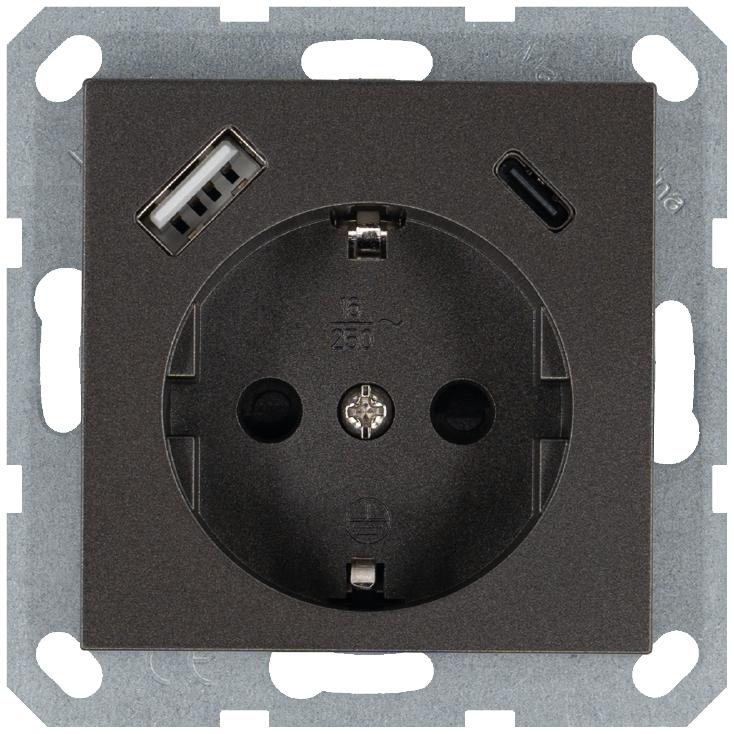 Розетка Shuko 16А с заземл. защ. шторки с 2-мя заряд. устройствами USB тип A+C 25Вт механизм мокко Jasmart G5501USB-25Z