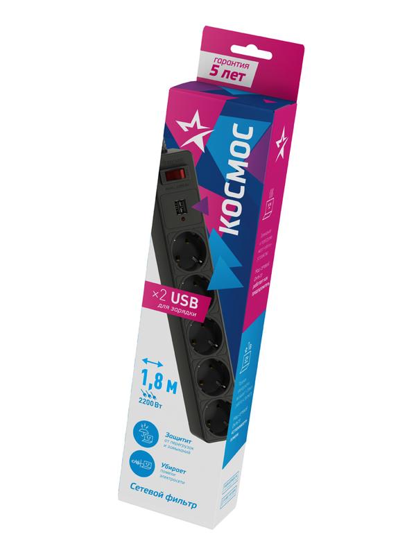 Удлинитель с сетевым фильтром 5х1.8м с заземл. 10А IP20 2.2кВт 2хUSB 3х0.75 с предохранителем КОСМОС FKsm1.8m-5g(B)USB