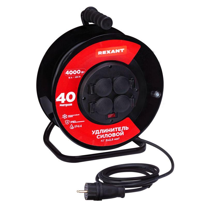 Удлинитель на метал. катушке 4х40м с заземл. IP44 КГ 3х2.5кв.мм с выключателем с защ. крышками Rexant 13-5015