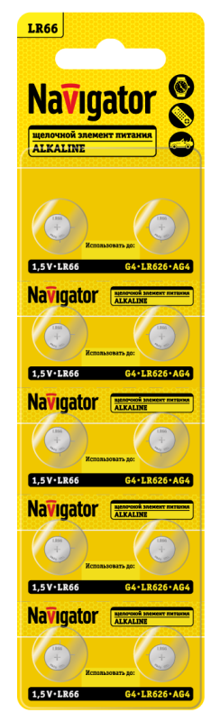 Элемент питания алкалиновый "таблетка" 95 666 NBT-09 (LR66 AG4 LR626 BP10) (блист.10шт) Navigator 95666