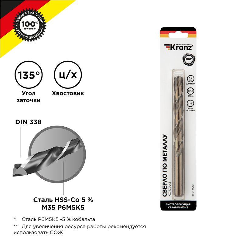 Сверло по металлу 12х151х101мм "Кобальт" (сталь HSS-Co 5% M35 P6M5K5) DIN 338 блист. Kranz KR-91-0513