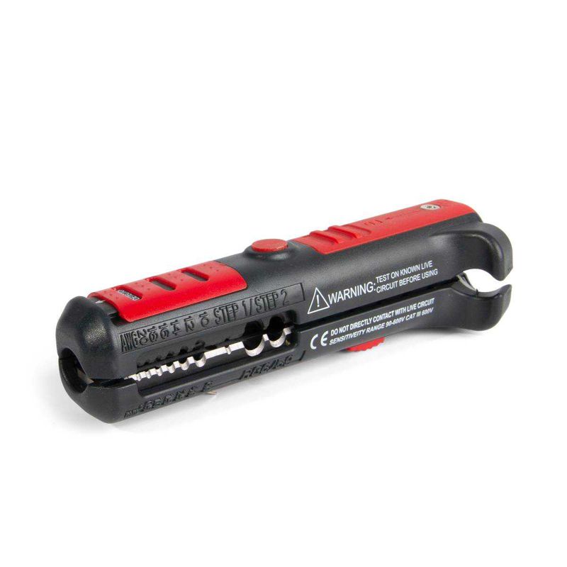 • 5 в 1: • снятие изоляции с проводов 0.5–6.0 мм2 • поперечная разделка круглых кабелей ? 8–13 мм • продольная разделка круглых кабелей ? от 5 мм • зачистка коаксиальных кабелей RG-6/59 • бесконтактный детектор напряжения 90-600В • Разделка круглых кабелей торцевыми лезвиями: • NYM от 2х1.5 до 5х2.5 мм2 • ПВС от 2х0.75 до 5х2.5 мм2 • МКЭШ от 2х0.5 до 14х0.75 мм2 • ПВ/АПВ от 10 до 70 мм2 • Встроенный бесконтактный детектор для определения наличия напряжения в сети 90-600В расположен под задней крышкой механизма и работает от двух батареек LR44 • Кнопка включения/выключения детектора напряжения • Звуковая и световая индикация при работе детектора • Светодиодные индикаторы под сдвижной панелью • Встроенные торцевые лезвия: • V-образные торцевые лезвия для снятия оболочки кабелей и проводов • для продольной разделки круглых кабелей и проводов • Прецизионные боковые лезвия: • 6 профилей для снятия изоляции с проводов 0.5-6 мм2 • 2 профиля дл разделки кабелей RG-6/59 • Выдвижное лезвие для разделки кабелей и прочих работ • Твердость лезвий для снятия изоляции: HRC 60...64 • Раскрывающаяся рукоятка с замком-фиксатором и металлической клипсой для крепления на ремне • Вес: 70 г • Длина: 125 мм