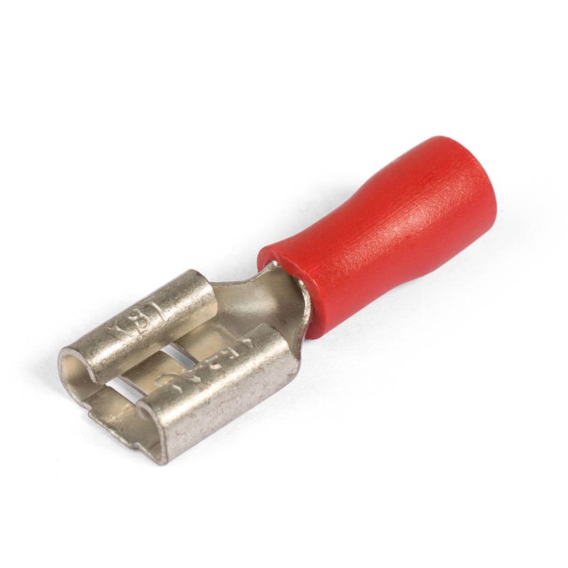 • Предназначены для монтажа быстроразъемных соединений многопроволочных гибких медных проводов методом опрессовки • Материал изоляции: самозатухающий ПВХ.Класс V-0 по UL94 • Термостойкость изоляции: 75 °C • Материал разъема: латунь марки Л63 • Покрытие разъема: электролитическое лужение • Максимальное напряжение: 400 В • Особенности конструкции: • поперечные засечки на внутренней поверхности трубной части разъемов увеличивают механическую прочность соединения с жилой • каждая клемма имеет конструктивный фиксатор замкового типа для прочного механического соединения с разъемом «папа» • Размер контакта определяется шириной «В» клеммы РПИ-П • Комплементарны разъемам РПИ-П и выходам типа «папа» на клеммах электрических устройств • Опрессовка проводника поверх изолирующей манжеты