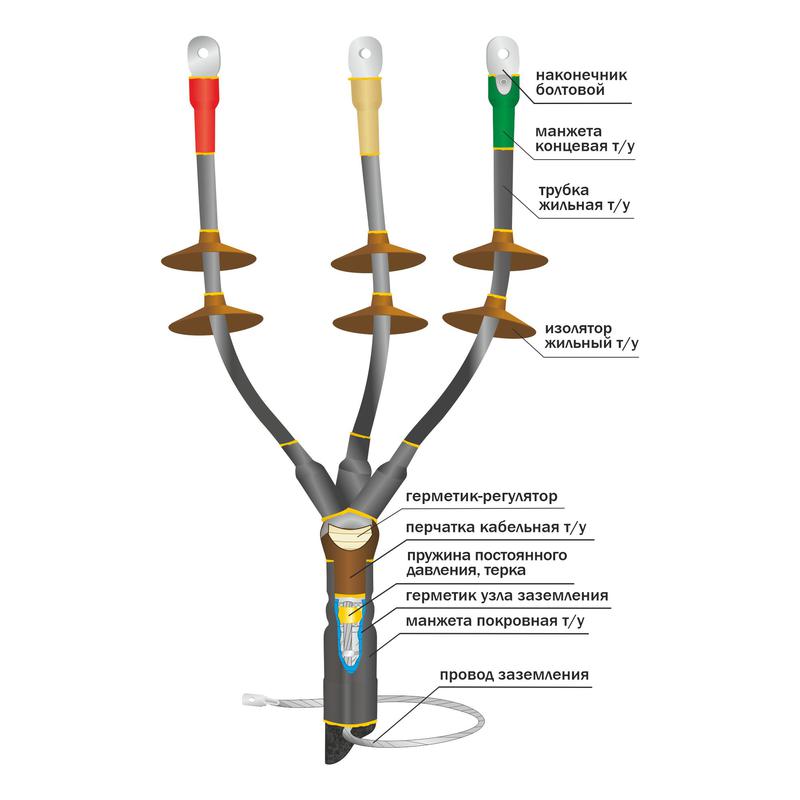 МУФТА КОНЦЕВАЯ ТЕРМОУСАЖИВАЕМАЯ МАРКИ 10КНТпН-3х(35-50) С НАКОНЕЧНИКАМИ БОЛТОВЫМИ НАРУЖНОЙ УСТАНОВКИ предназначена для оконцевания 3-х жильных силовых кабелей сечением 35, 50 кв.мм с бумажной пропитанной изоляцией на напряжение до 10 кВ включительно. Устанавливается на открытом воздухе при температуре окружающей среды от -50град.С до +50град.С и относительной влажности до 98%, в том числе в качестве мачтовой. Соответствует требованиям ГОСТ 13781.0-86 и ТУ Нева-Транс 3599-012-31930690-2016. Прошла необходимый комплекс независимых испытаний, на основании которых выдан сертификат соответствия Госстандарта России. Монтируется на разделке кабеля методом термоусаживания основных деталей из модифицированного полимера, входящих в комплект муфты, с помощью горелки или высокотемпературного фена. Оснащена жильными изоляторами, создающими на поверхности сухие зоны и увеличивающими длину путей токов утечки. Обеспечивает выравнивание напряженности электрического поля и герметизацию корешка разделки кабеля за счет применения специального герметика-регулятора. Предусматривает крепление провода заземления к металлической оболочке с помощью пружины постоянного давления и терки, что позволяет исключить возможность повреждения бумажной изоляции в случае применения припоя “А”, а к бронелентам методом пайки. Имеет высокую эксплуатационную надежность и экологическую безопасность. Устойчива к ультрафиолетовому излучению и воздействию атмосферных осадков.