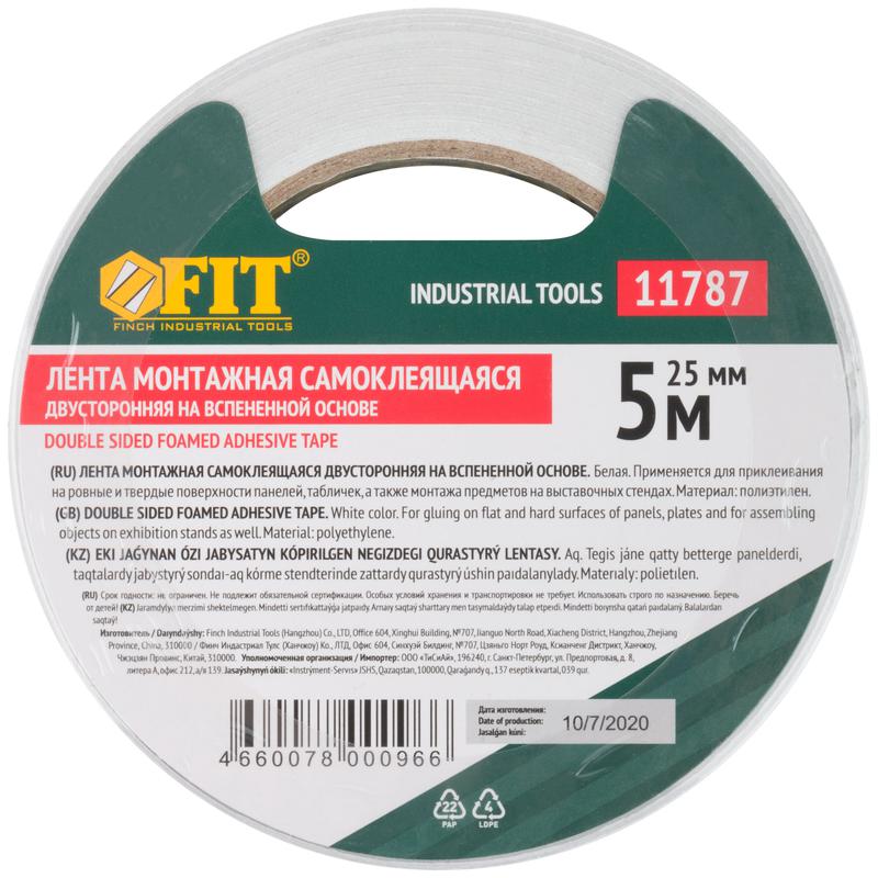 Лента клеящая 2-х сторонняя монтажная на вспененной основе 25ммх5м бел. FIT 11787