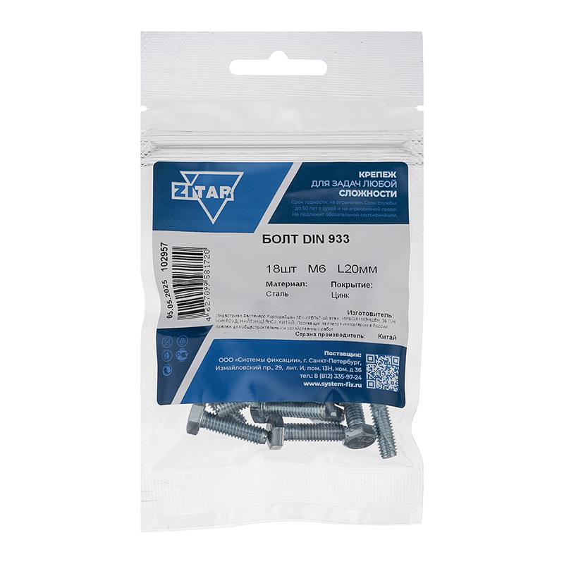 Болт с шестигранной головкой М6х20 DIN 933 класс прочн. 8.8 оцинк. (коробка) (уп.18шт) Tech-Krep/Zitar 102957