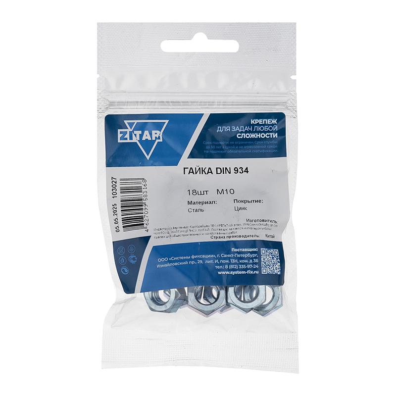 Гайка шестигранная М10 DIN 934 цинк. (пакет) (уп.18шт) Tech-Krep/Zitar 103027