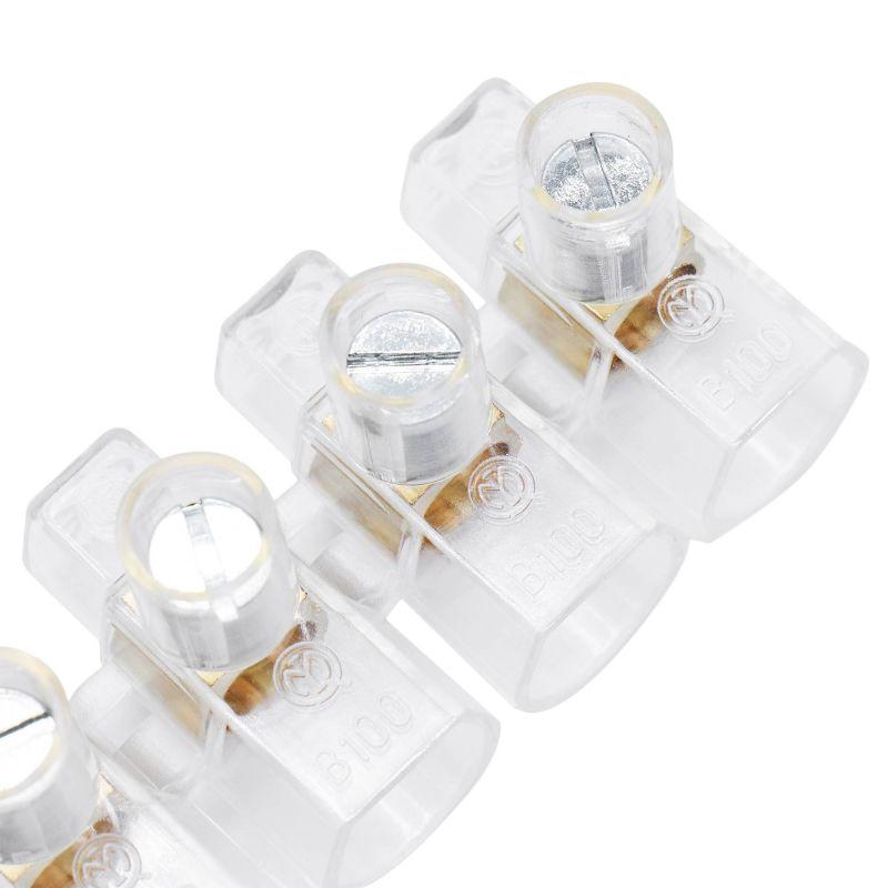 Зажим винтовой c одним отверстием предназначен для обеспечения надежного электрического соединения с помощью винтовой фиксации проводников между собой в цепях переменного или постоянного тока с напряжением до 400 В. Распространенное применение в распаячных коробках (для подключения электрических выключателей, розеток и т.д.) для подключения люстр и других световых приборов. Максимальное сечение проводника – 4 мм2. Прочные винты из оцинкованной стали, непозволящие сорвать резьбу. Материал изоляции – поликарбонат самозатухающий. Повышенная термоустойчивость: до +130 °С.