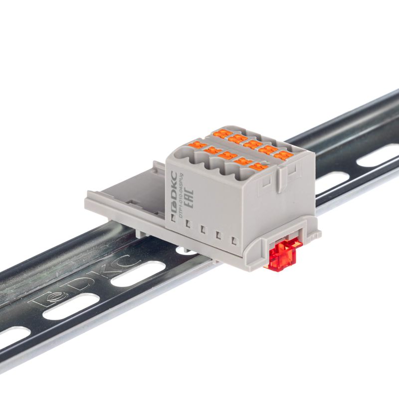 Блок распределительный с вертикал. адаптером на рейки шир. 15/35мм зажим push-in 10 точек подключения 2.5кв.мм сер. DKC DTP1-010-04SPUG-V