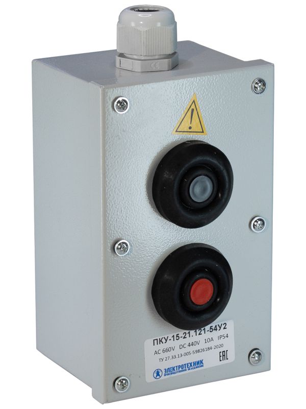 Пост кноп. ПКУ 15-21.121-54 У2 (1хКЕ081/2 (1з+1р) черн. + 1хКЕ081/2 (1з+1р) красн. + PG-19) пост управления Электротехник ET054487 представляют собой средство управления коммутацией электрических цепей управления переменного тока. Корпус металлический, штампованный. Коммутационная износостойкость контактов кнопок предусматривает 5 млн. циклов. IP54. Монтируется на ровную поверхность. Предназначены для работы под напряжением до 660 В, частотой 50 Гц и постоянного тока до 440 В.