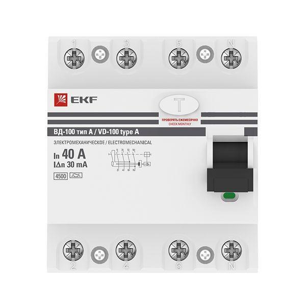 Выключатель дифференциального тока (УЗО) 4п 40А 30мА тип A ВД-100 (электромех.) PROxima EKF elcb-4-40-30-em-a-pro