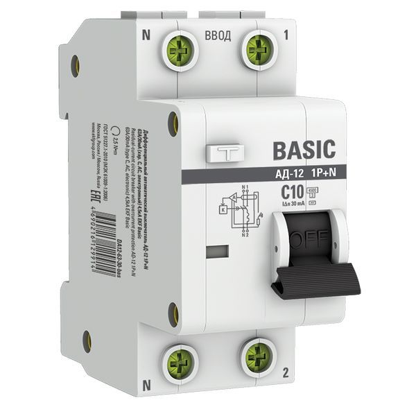 Выключатель автоматический дифференциального тока 2п (1P+N) C 10А 30мА тип AC 4.5кА АД-12 Basic EKF DA12-10-30-bas