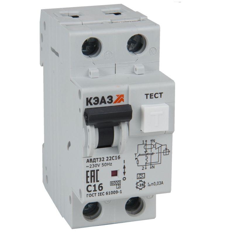 Выключатель автоматический дифференциального тока 2п C 16А 30мА тип A 6кА АВДТ32-22C16 A УХЛ4 КЭАЗ 228065