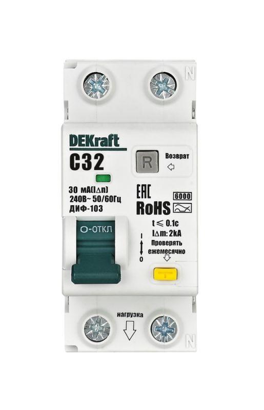 Выключатель автоматический дифференциального тока (АВДТ) 1P+N 32А 30мА AC х-ка C ДИФ-103 6кА DEKraft 16314DEK