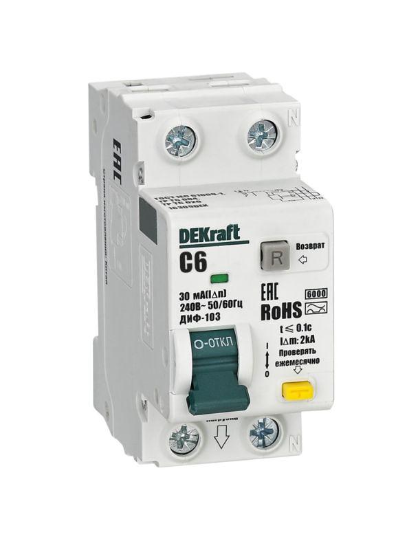 Выключатель автоматический дифференциального тока (АВДТ) 1P+N 6А 30мА AC х-ка C ДИФ-103 6кА DEKraft 16309DEK