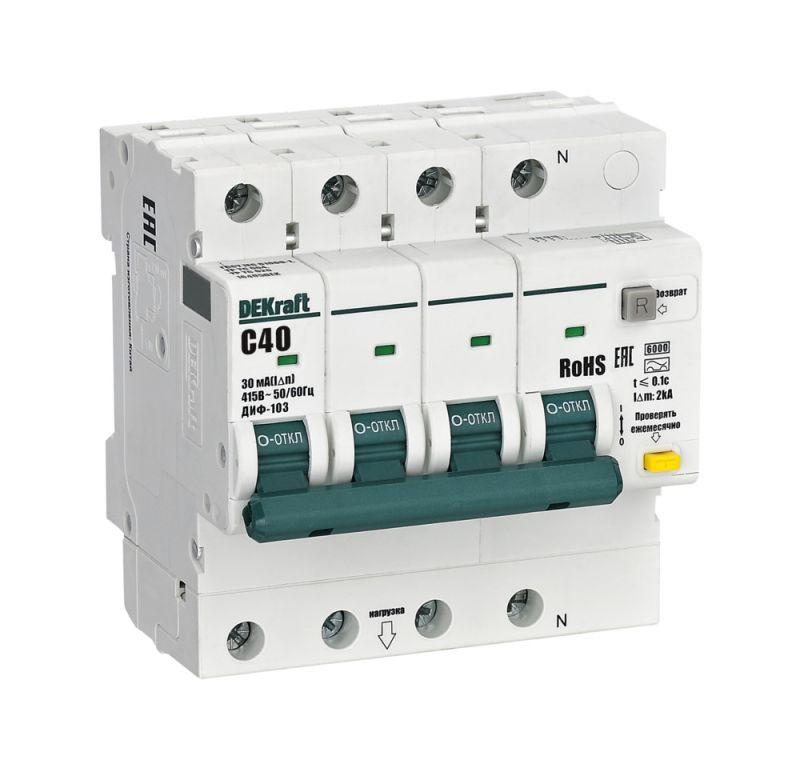Автоматические выключатели дифференциального тока серии ДИФ-103 6кА NEW Dekraft; 3P+N; номинальный ток 40 А; ном. диф. ток 30 мА; тип диф. расцепителя - AC; кривая отключения - С; Icn, Ics = 6 кА; тип устройства - электронный; монтаж – на DIN-рейку. АВДТ обеспечивают три вида защиты — от короткого замыкания, перегрузки и возникновения утечки тока (в частности, вследствие прикосновения человека к токоведущим частям). АВДТ с отключающей способностью 6кА применяются во вводно-распределительных устройствах (ВРУ), главных распределительных щитах (ГРЩ), осветительных и распределительных установках в общественных, административных, производственных, промышленных и других подобных зданиях.
