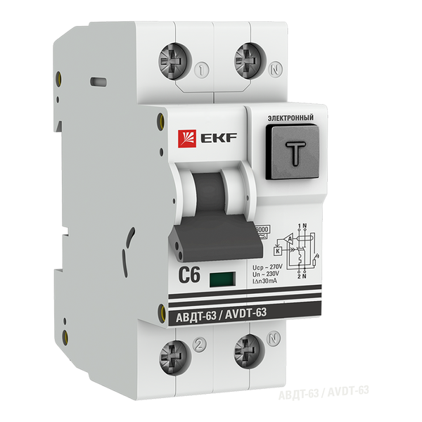 Автоматический выключатель дифференциального тока АВДТ-63 EKF PROxima представляет аппарат, сочетающий функции автоматического выключателя с электромеханическим или электронным УЗО. При обнаружении автоматическим выключателем в защищаемом участке сети тока утечки (повреждения) на землю или сверхтока (тока перегрузки иликороткого замыкания) происходит срабатывание устройства, приводящее к отключению защищаемой сети. Возможна коммутация алюминиевым и медным проводником.Автоматический выключатель дифференциального тока малогабаритный АВДТ-63М EKF PROxima представляет аппарат, сочетающий функции автоматического выключателя с электронным УЗО типа АС в компактном корпусе шириной один модуль. При обнаружении автоматическим выключателем на защищаемом участке сети тока утечки (повреждения) на землю или сверхтока (тока перегрузки или короткого замыкания) происходит срабатывание устройства, приводящее к отключению защищаемой сети. Особое отличие дифференциальных автоматических выключателей EKF с электронным УЗО – в наличии блока защиты от перенапряжения. Возможна коммутация алюминиевым и медным проводом.