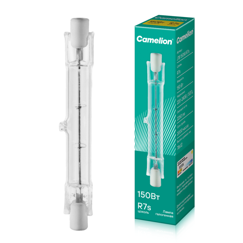 Лампа галогенная линейн. J R7s 150Вт Camelion 2933 – лампа сетевого напряжения без отражателя, трубчатая, с прозрачной колбой, длиной 78 мм, с односторонним цоколем R7s, мощностью 150 Вт. Цветовая температура 2850 К.