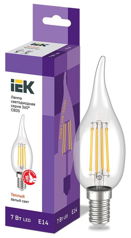 Лампа светодиодная филаментная 360° 7Вт CB35 свеча на ветру 3000К E14 230В IEK LLF-CB35-7-230-30-E14-CL