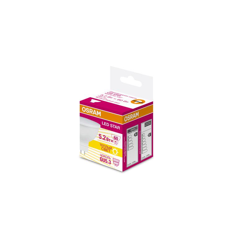 Лампа светодиодная LED STAR MR16 5.2W/830 (замена 60Вт) 5.2Вт пласт. 3000К тепл. бел. GU5.3 500лм 110 град. 220-240В OSRAM 4058075129122