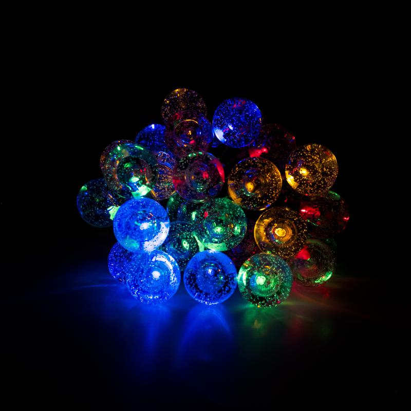 Светодиодный светильник-гирлянда "КРИСТАЛЛИЧЕСКИЕ ШАРИКИ" с солнечной батареей. Предназначен для декоративной подсветки кустарников, альпийских горок, террас, веранд на садовых и дачных участках, балконов и т.п. Автоматическое включение/выключение при наступлении темного/светлого времени суток (датчик освещенности) 8 режимов работы: комбинированный, волнообразный, последовательный, перетекающий, бегущая вспышка, затухающий, мерцающий, постоянный. Время непрерывной работы при полностью заряженном аккумуляторе 8 часов. Материал корпуса светодиодной панели и колышка – ABS-пластик, в гирлянде используется медный провод. Светильник можно устанавливать в грунт и на вертикальную поверхность. Крепеж (два самореза и дюбеля) входит в комплект поставки.