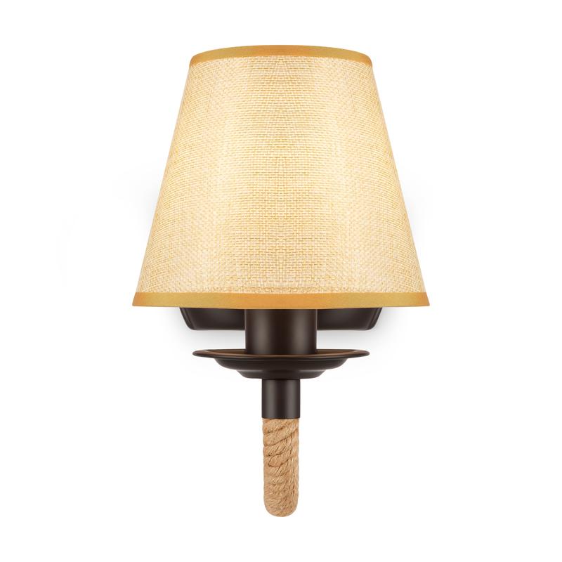 Серия светильников создана под влиянием основных принципов эко-дизайна, с использованием натуральных материалов для предметов интерьера. Арматура люстры из матового черного металла с легким золотым патинированием гармонично сочетается с абажурами из холщовой натуральной ткани. Рожки и центральная часть люстры плотно обвиты холщовой веревкой. Окантовка на верхней и нижней части абажура желто-песочного цвета.
