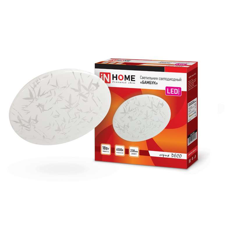 Светодиодный светильник БАМБУК серии DECO от ТМ In Home в светлом матовом корпусе украшен принтом в виде стилизованных листьев бамбука. Согласно древнему китайскому учению фен-шуй, изображение этого растения приносит в дом удачу, счастье и процветание. Линейка светильников БАМБУК представлена в трех размерах от 190 до 350 мм. Несколько вариаций мощности (в диапазоне от 12 Вт до 36 Вт) позволяют подобрать оптимальный осветительный прибор, в зависимости от конфигурации и габаритов помещения. Применение Светодиодные светильники БАМБУК серии DECO предназначены для внутреннего освещения жилых помещений, подъездов и сферы ЖКХ, офисных и административных учреждений, магазинов, а также холлов, коридоров, лестничных пролётов, подсобок и других помещений вспомогательного назначения. Преимущества Современные светильники серии DECO, работающие на основе последнего поколения светодиодов, обеспечивают яркий равномерный световой поток при максимальной экономии электроэнергии. Отсутствие пульсации гарантирует сохранность здоровья глаз. Светодиодные светильники являются одним из самых экологически безвредных источников света и не требуют специальной утилизации и переработки. Светильники получили сертификат таможенного союза EAC. Производятся по ГОСТу Р МЭК 60598-1-2011. Монтаж Светодиодные светильники серии DECO применяются для работы в сетях переменного тока напряжением 230В ± 10% с частотой 50 герц. Перед установкой следует убедиться в правильности напряжения питающей сети и наличии защитного устройства в цепи (автоматический выключатель, предохранитель). Этапы установки: отключите сетевое напряжение, извлеките светильник из упаковки, открутите плафон светильника, повернув его по часовой стрелке. Через клеммную колодку подключите подготовленные концы проводов осветительного прибора к проводу сети. Установите светильник на поверхности и зафиксируйте при помощи дюбелей и саморезов. Сборку светильника следует осуществлять в обратной последовательности.