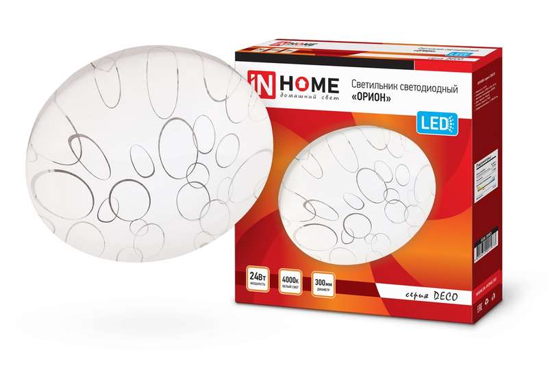 Светодиодный светильник круглой формы ОРИОН серии DECO от ТМ In Home в классическом белом корпусе с нейтральным абстрактным рисунком удачно впишется в любой современный интерьер. Линейка светильников ОРИОН представлена в трех размерах от 190 до 350 мм. Несколько вариаций мощности (в диапазоне от 12 Вт до 36 Вт) позволяют подобрать оптимальный осветительный прибор, в зависимости от конфигурации и габаритов помещения. Применение Светодиодные светильники ОРИОН серии DECO предназначены для внутреннего освещения жилых помещений, подъездов и сферы ЖКХ, офисных и административных учреждений, магазинов, а также холлов, коридоров, лестничных пролётов, подсобок и других помещений вспомогательного назначения. Преимущества Современные светильники серии DECO, работающие на основе последнего поколения светодиодов, обеспечивают яркий равномерный световой поток при максимальной экономии электроэнергии. Отсутствие пульсации гарантирует сохранность здоровья глаз. Светодиодные светильники являются одним из самых экологически безвредных источников света и не требуют специальной утилизации и переработки. Светильники получили сертификат таможенного союза EAC. Производятся по ГОСТу Р МЭК 60598-1-2011. Монтаж Светодиодные светильники серии DECO применяются для работы в сетях переменного тока напряжением 230В ± 10% с частотой 50 герц. Перед установкой следует убедиться в правильности напряжения питающей сети и наличии защитного устройства в цепи (автоматический выключатель, предохранитель). Этапы установки: отключите сетевое напряжение, извлеките светильник из упаковки, открутите плафон светильника, повернув его по часовой стрелке. Через клеммную колодку подключите подготовленные концы проводов осветительного прибора к проводу сети. Установите светильник на поверхности и зафиксируйте при помощи дюбелей и саморезов. Сборку светильника следует осуществлять в обратной последовательности.