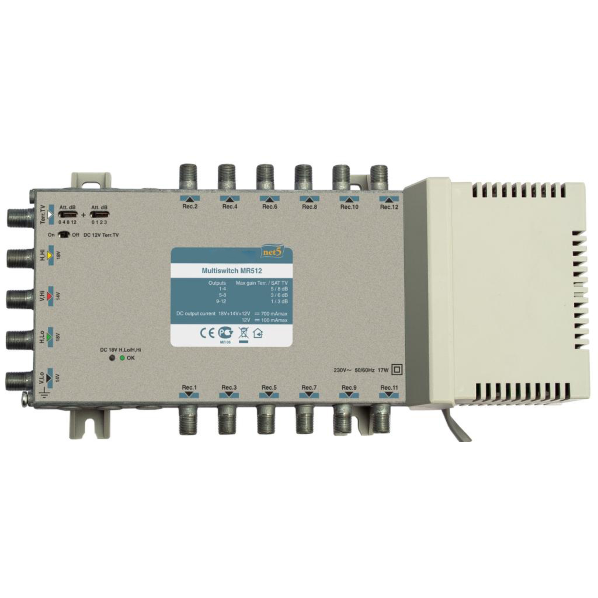 Мультисвитч MR512 предназначен для распределительных сетей сигналов 4-ех спутниковых поляризаций и наземного ТВ до 12 абонентов по схеме "звезда"