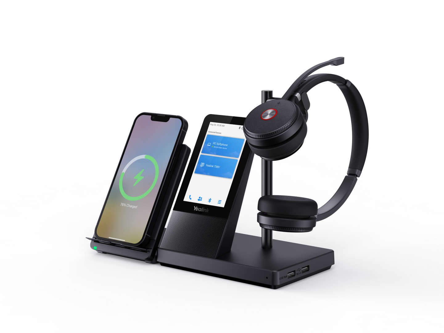 Базовая станция гарнитуры обладает сенсорным дисплеем 4'' с разрешением 480x800 пикселей, встроенным спикерфоном, беспроводной зарядной подставкой для смартфона (опционально).